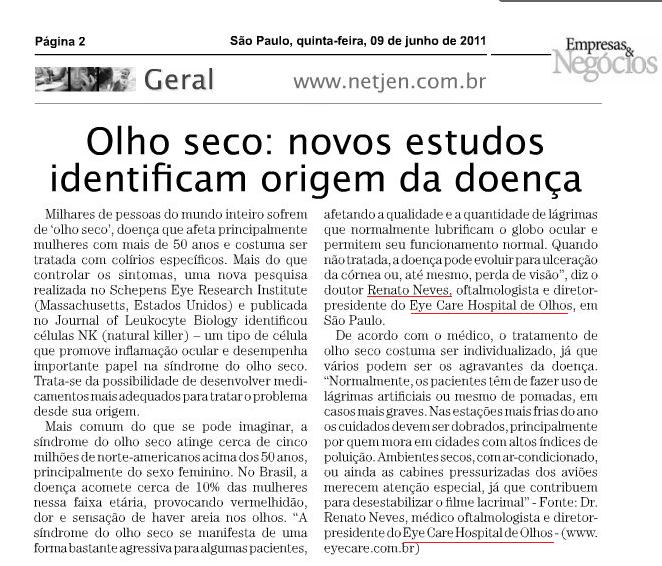 Clipping JORNAL EMPRESAS & NEGÓCIOS - Olho seco: novos estudos identificam origem da doença 10/06/2011