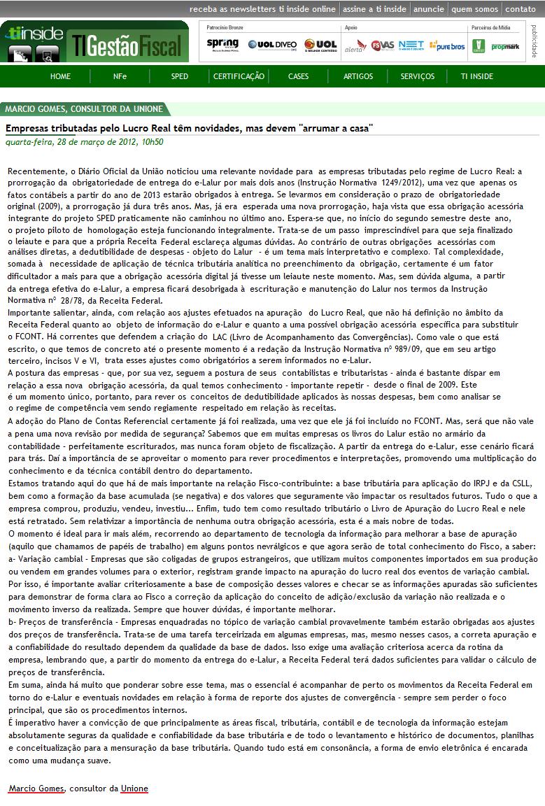 Clipping TI INSIDE OUT SOURCING - Empresas tributadas pelo Lucro Real têm novidades, mas devem "arrumar a casa" 25/05/2012