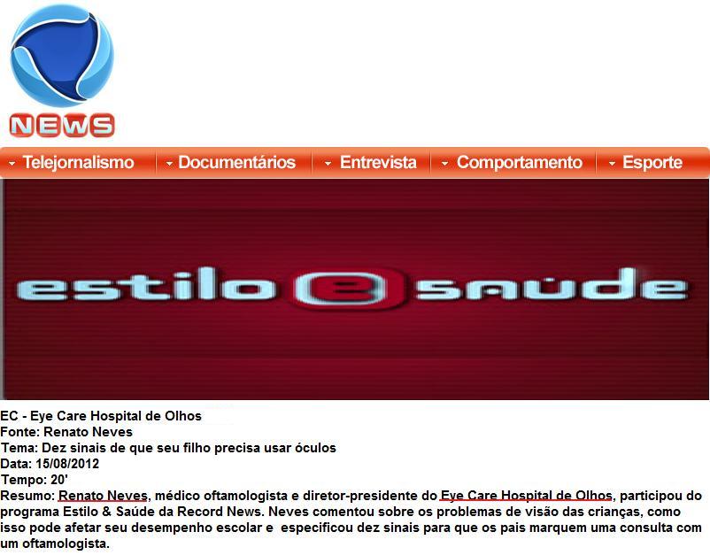 Clipping ESTILO & SAÚDE (RECORD NEWS) (TV) - Dez sinais de que seu filho precisa usar óculos 21/08/2012