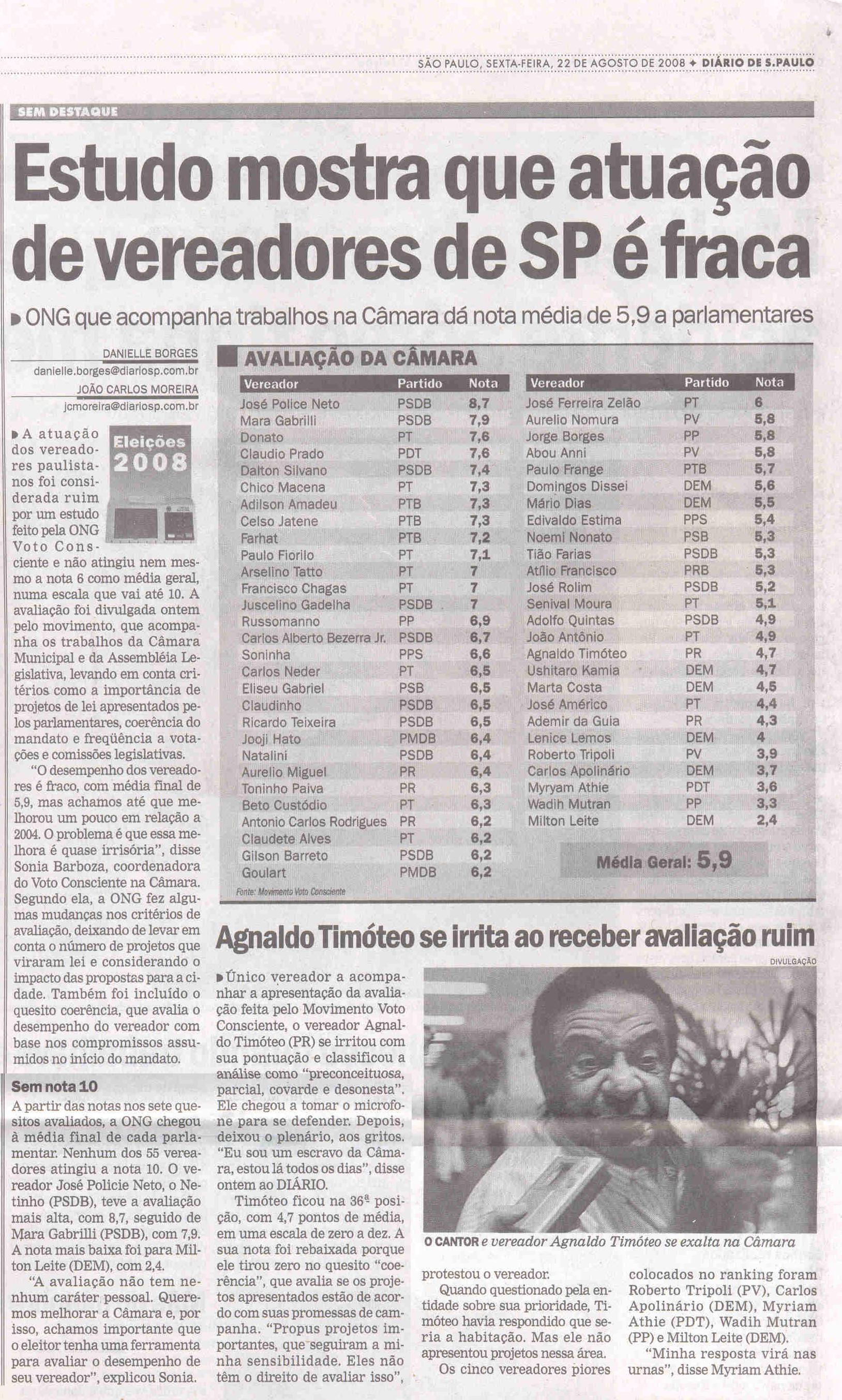 Clipping Diário de S. Paulo (22 Ago) - Estudo mostra que atuação de vereadores de SP é fraca 22/08/2008