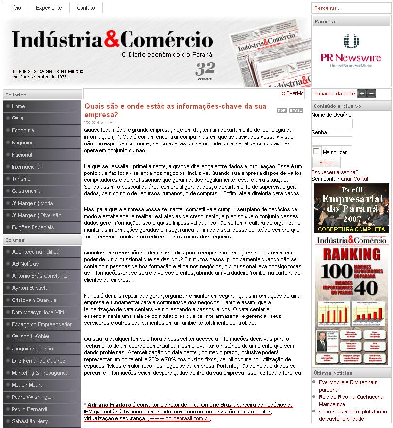 Clipping Jornal Indústria & Comércio (23 Set) - Onde estão as informações-chave da sua empresa? 24/09/2008
