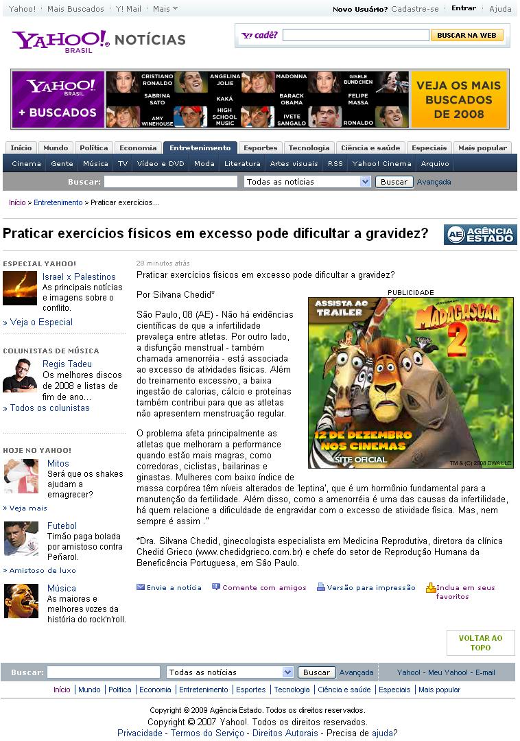 Clipping Portal Yahoo - Praticar exercícios físicos em excesso pode dificultar a gravidez? 08/01/2009