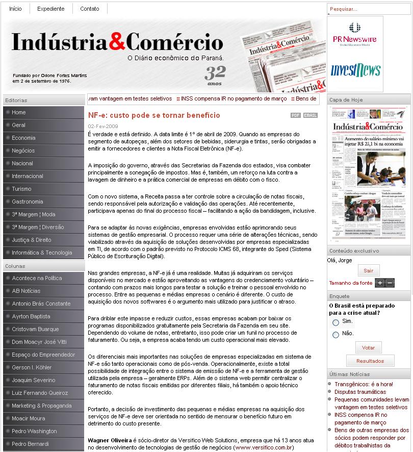 Jornal Indústria & Comércio (2 Fev) - NF-e: custo pode se tornar benefício