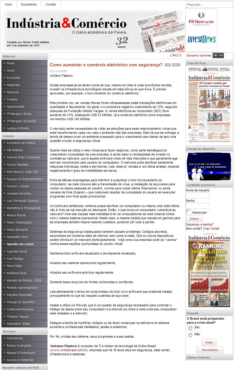 Clipping Jornal Indústria & Comércio (2 Jun) - Como aumentar o comércio eletrônico com segurança? 03/06/2009