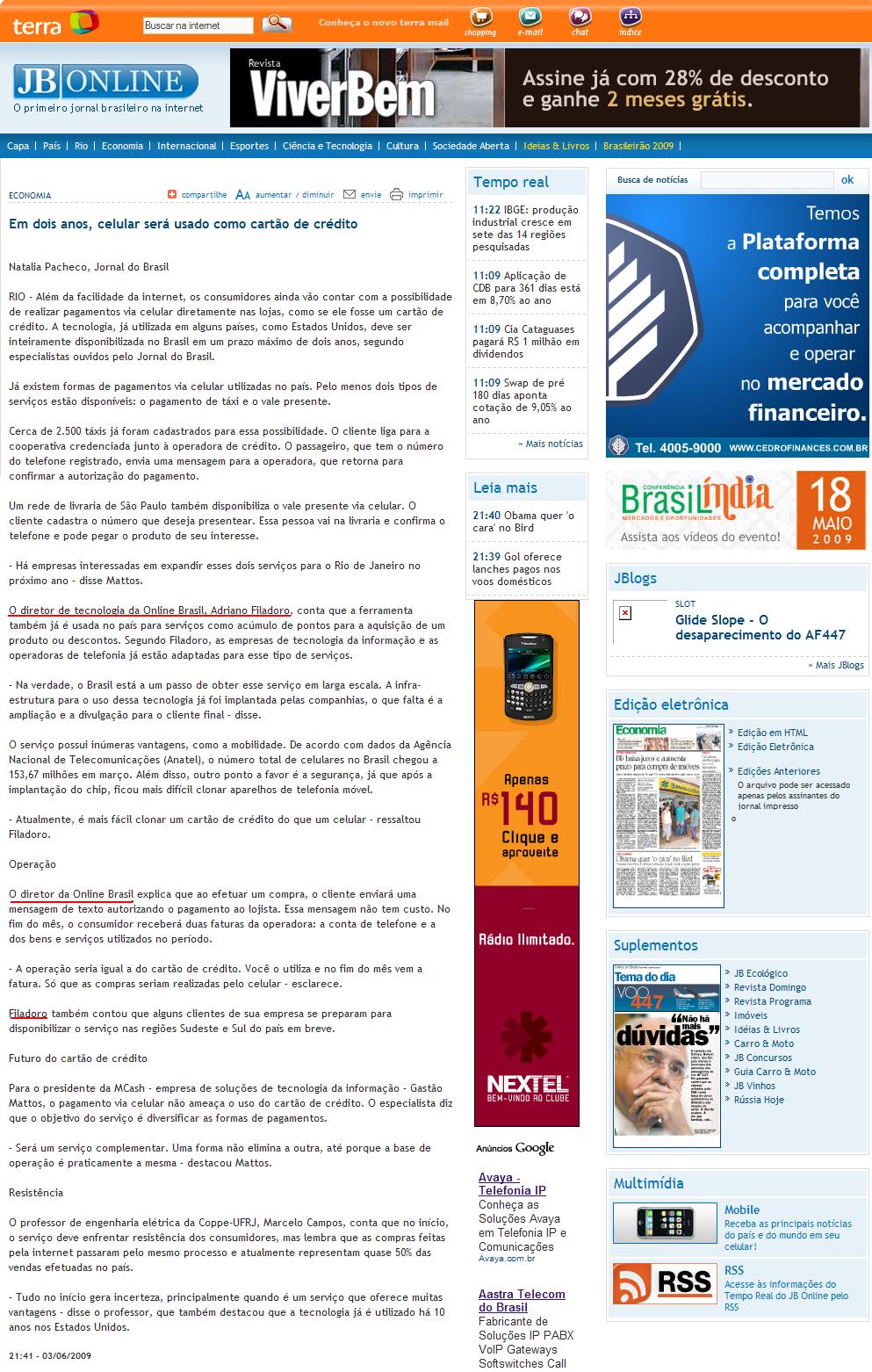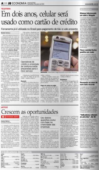 Clipping Jornal do Brasil / RJ (4 Jun) - Em dois anos, celular será usado como cartão de crédito 04/06/2009