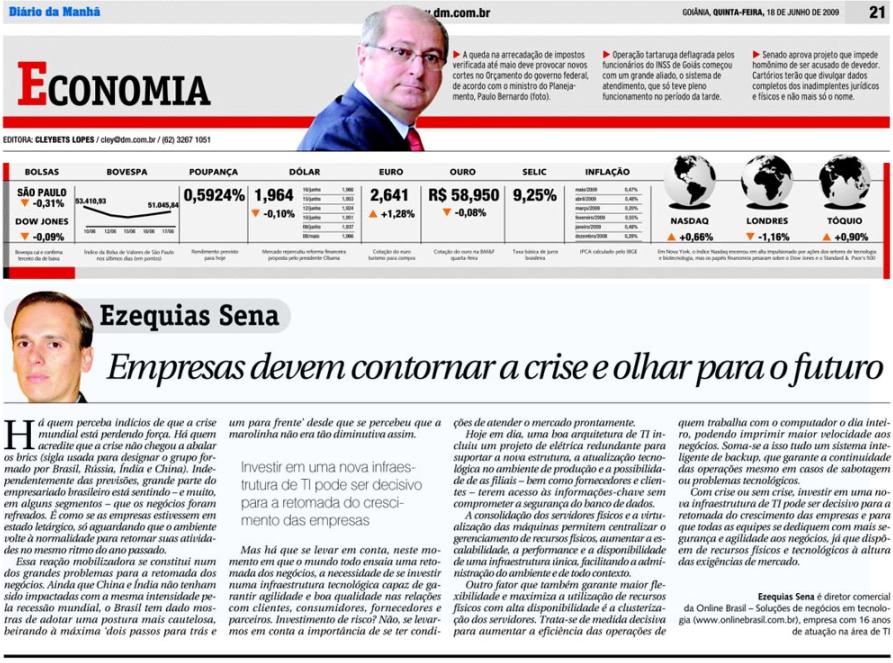 Clipping Diário da Manhã - Goiânia/GO (18 Jun) - Empresas devem contornar a crise e olhar o futuro 18/06/2009