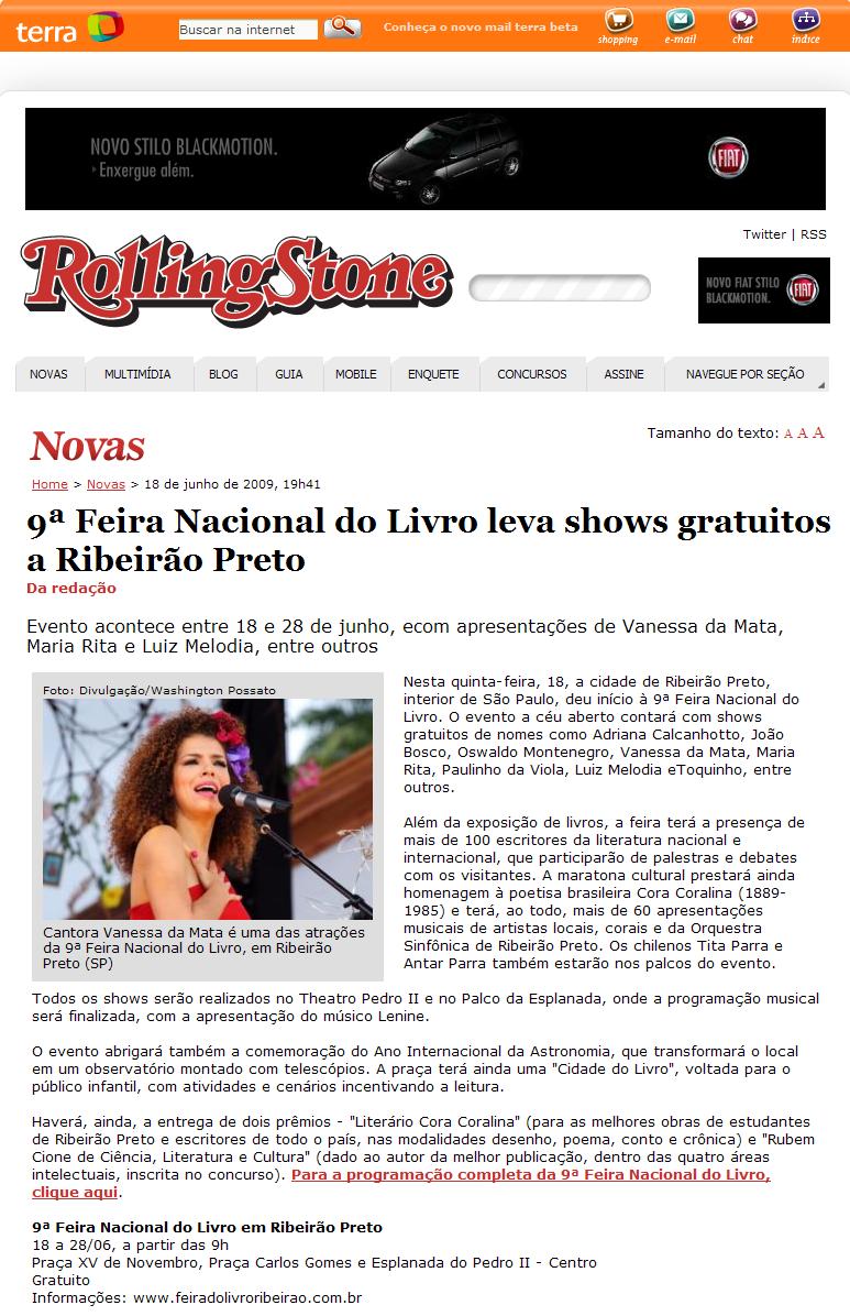 Clipping Site Revista Rolling Stones - 9ª Feira Nacional do Livro leva shows gratuitos a Ribeirão Preto 19/06/2009