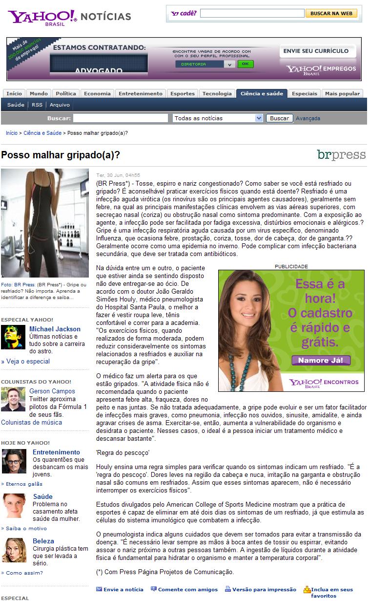 Portal Yahoo (Chamada de capa + matéria) - Posso malhar gripado (a)?