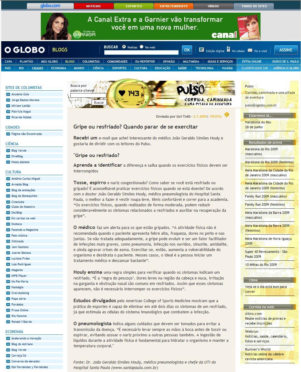 Blog Pulso (O Globo) - Gripe ou resfriado? Quando parar de se exercitar