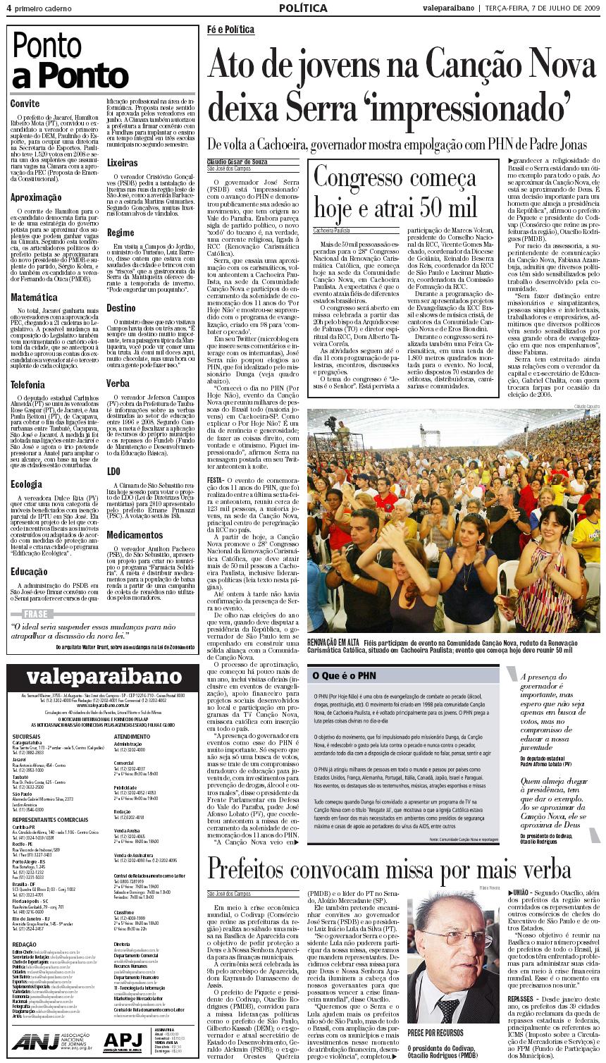 Vale Paraibano - Ato de jovens na Canção Nova deixa Serra 'impressionado'