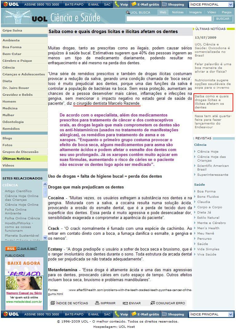 Clipping Portal UOL (Ciência & Saúde) - Saiba como e quais drogas lícitas e ilícitas afetam os dentes 13/07/2009