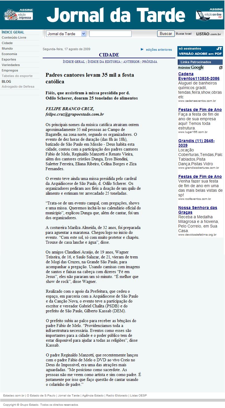 Jornal da Tarde (17 Ago) - Padres cantores levam 35 mil a fests