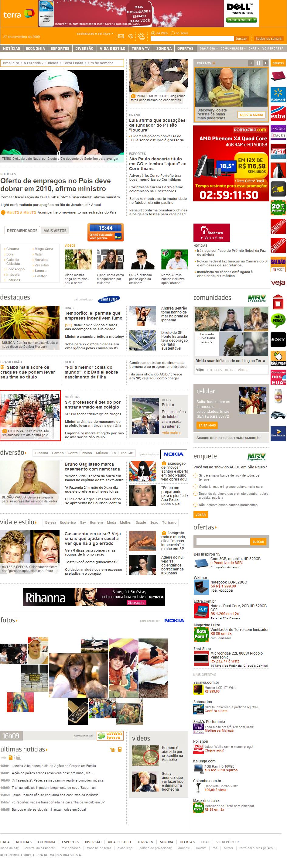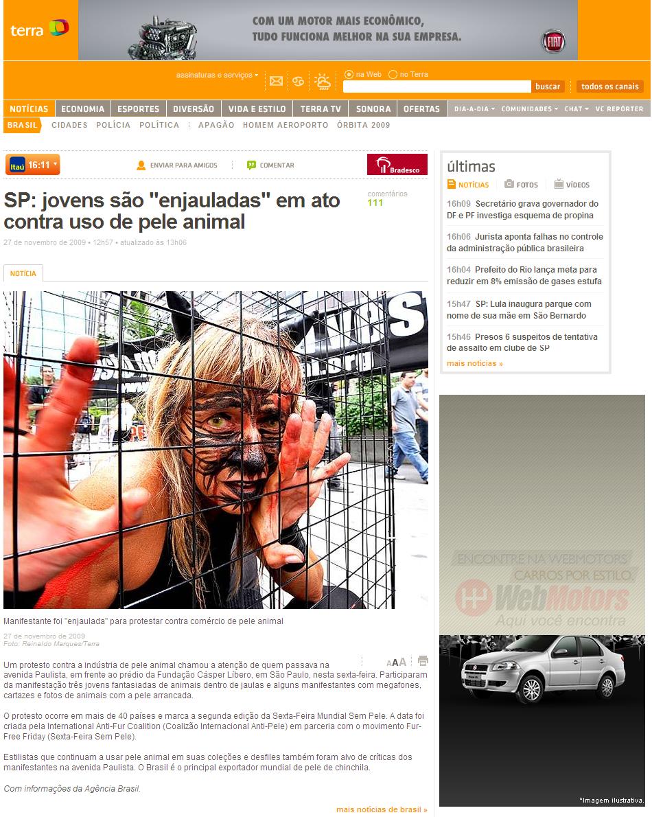 Clipping Portal Terra (Chamada de capa + matéria) - SP: jovens são enjauladas em ato contra uso de pele animal 27/11/2009