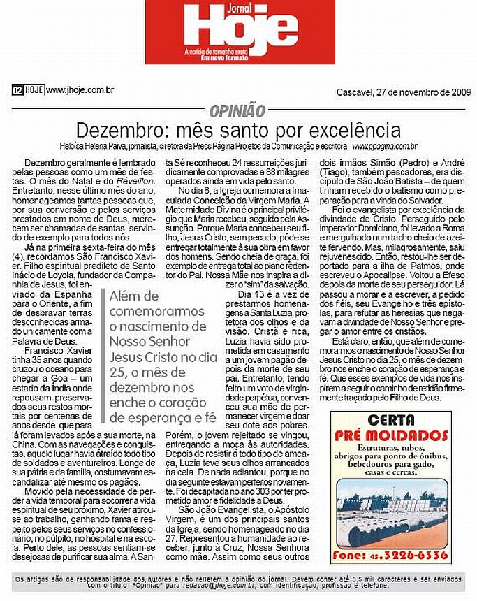 JORNAL HOJE (Cascavel/PR) - Dezembro: mês santo por excelência