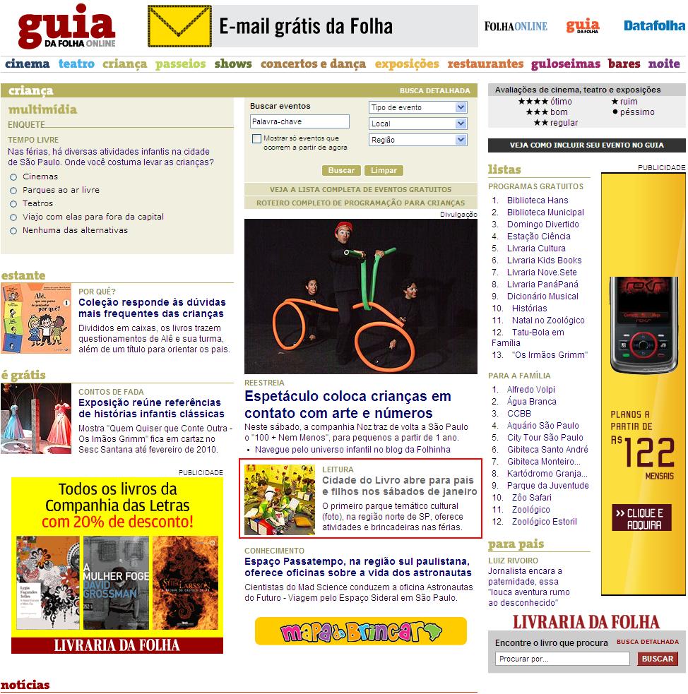 Clipping FOLHA ONLINE (CHAMADA DE CAPA + MATÉRIA) - Cidade do Livro abre para pais e filhos nos sábados de janeiro 05/01/2010
