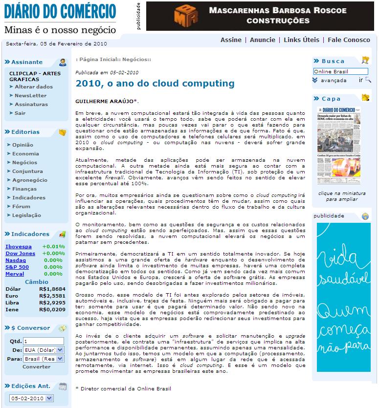 DIÁRIO DO COMÉRCIO/MG (5 Fev) - 2010, o ano do cloud computing