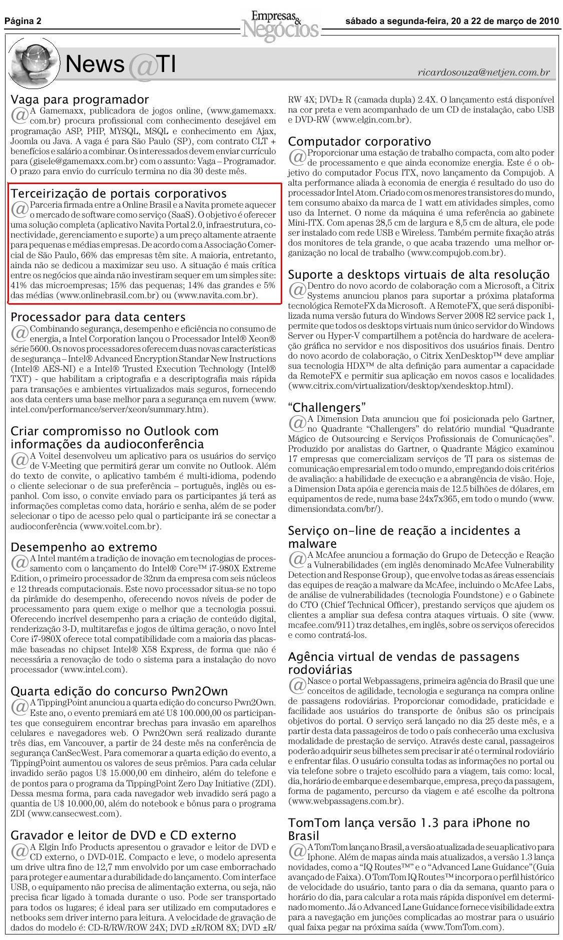 JORNAL EMPRESAS & NEGÓCIOS (22 MAR) - Terceirização de portais corporativos
