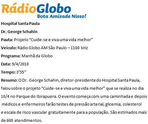 Clipping RÁDIO GLOBO AM / MANHÃ DA GLOBO - Hospital Santa Paula promove atendimento gratuito no Pq. do Ibirapuera 09/04/2010