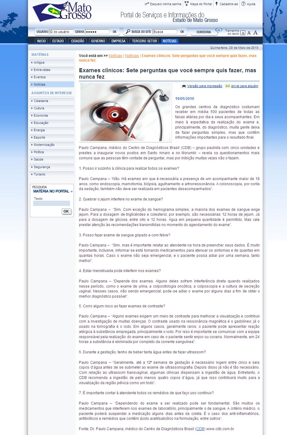 Clipping PORTAL ESTADO DO MATO GROSSO - Exames clínicos: sete perguntas que você sempre quisa fazer, mas nunca fez 20/05/2010