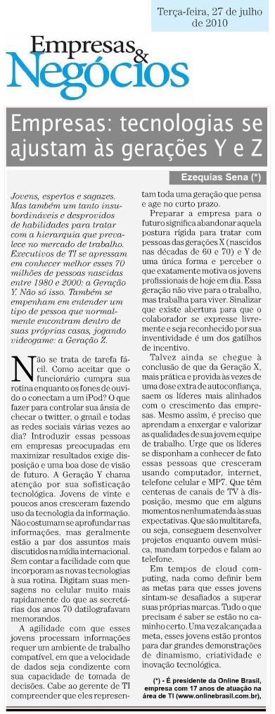 Clipping JORNAL EMPRESAS & NEGÓCIOS (IMPRESSO) - Empresas: tecnologias se ajustam às gerações Y e Z 28/07/2010