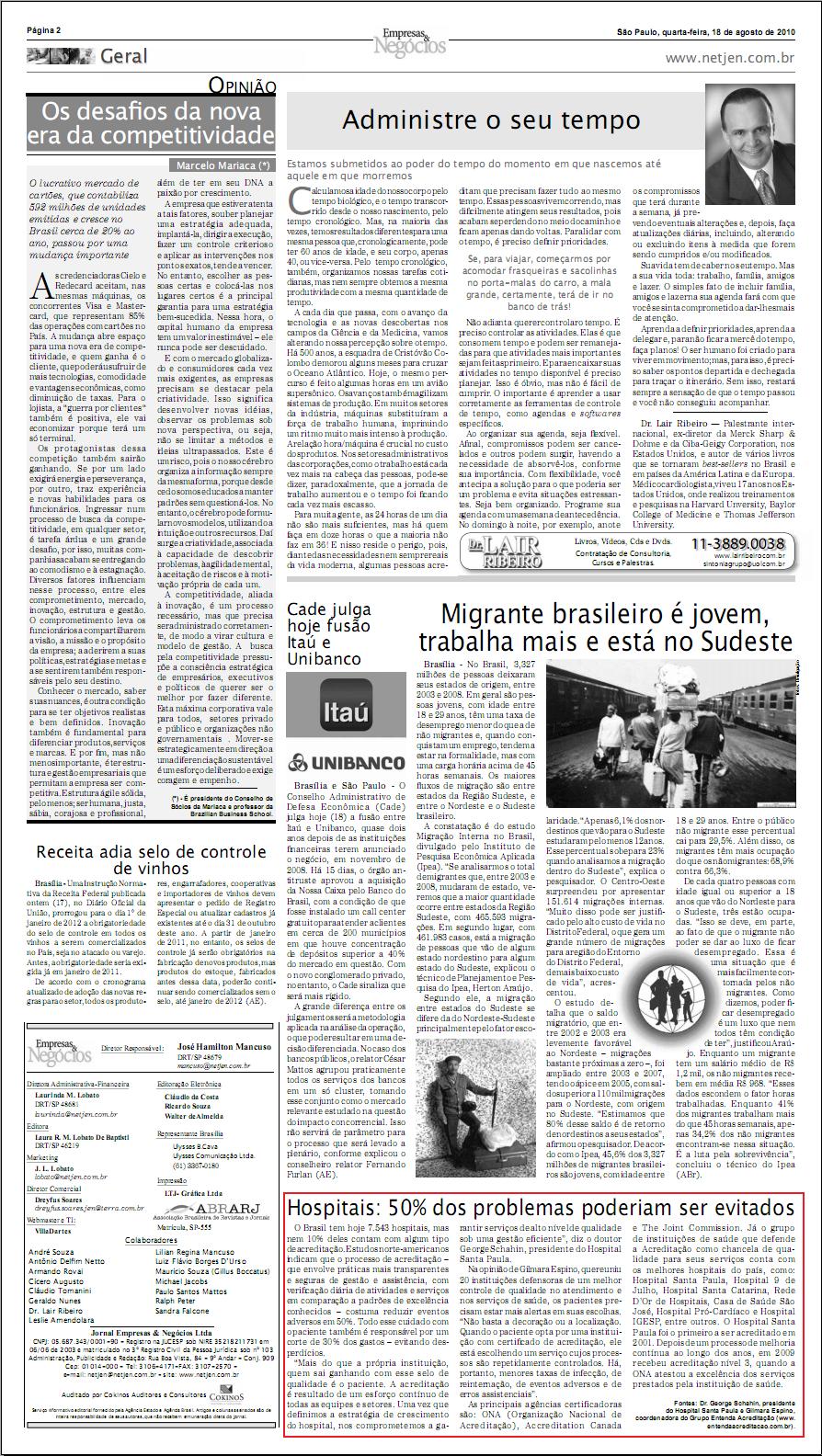 Clipping JORNAL EMPRESAS & NEGÓCIOS (IMPRESSO) - Hospitais: 50% dos problemas poderiam ser evitados 18/08/2010