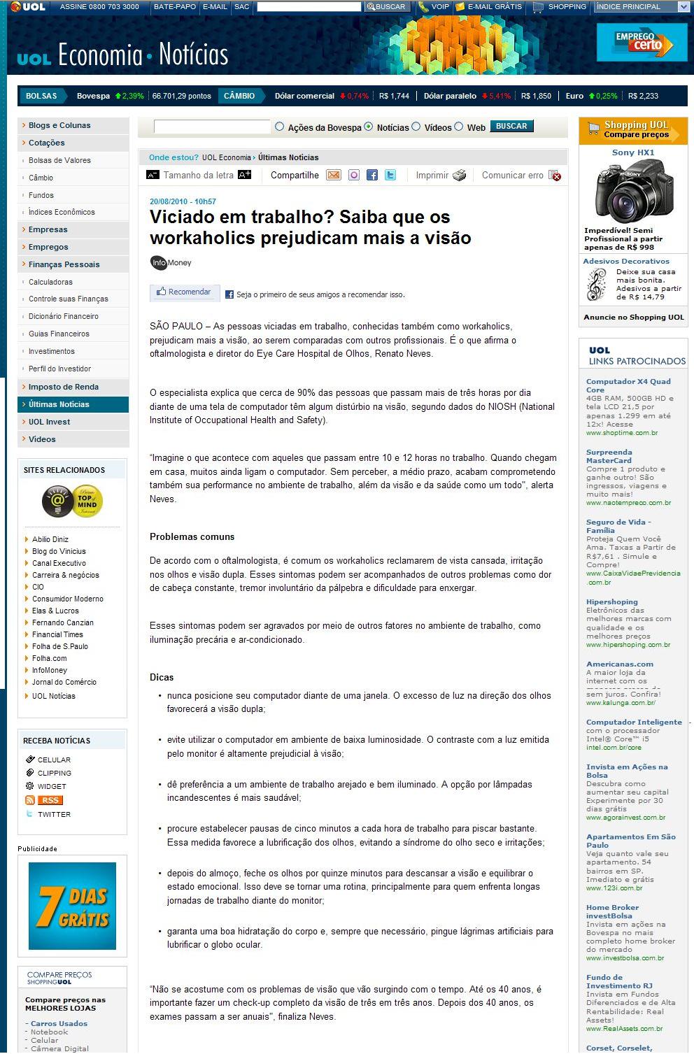 Clipping PORTAL UOL ECONOMIA - Viciado em trabalho? Saiba que workaholics prejudicam mais a visão 01/09/2010