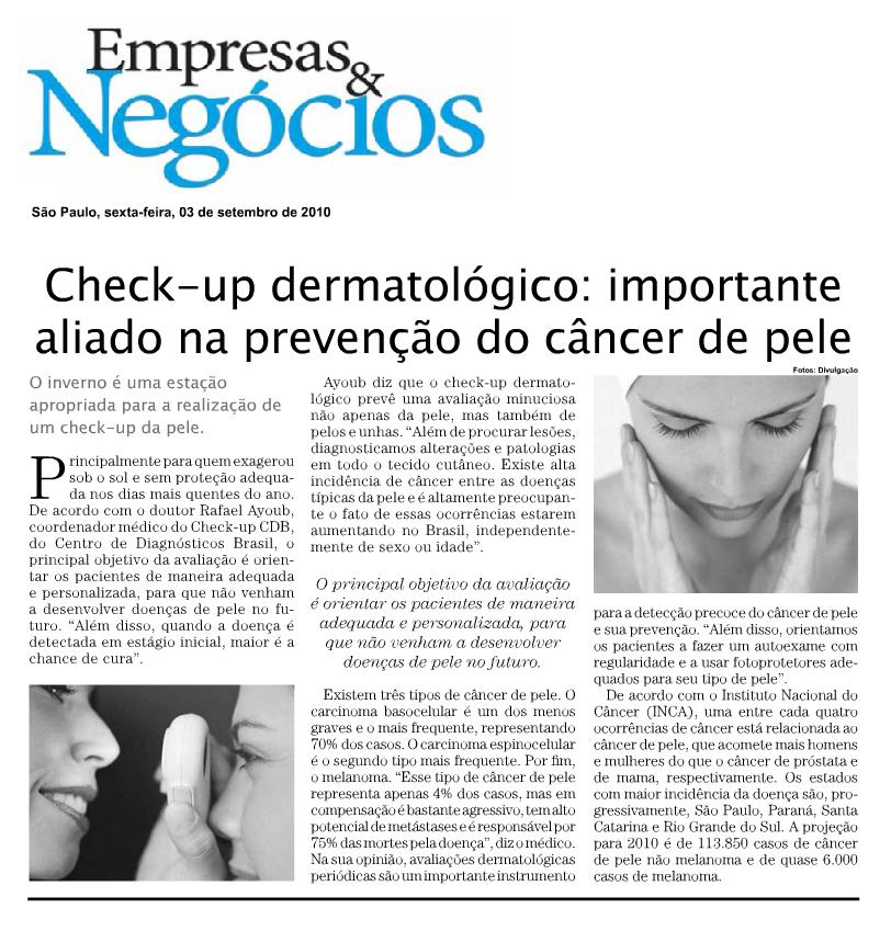 Clipping JORNAL EMPRESAS & NEGÓCIOS - Check-up dermatológico: aliado da prevenção ao câncer de pele 03/09/2010