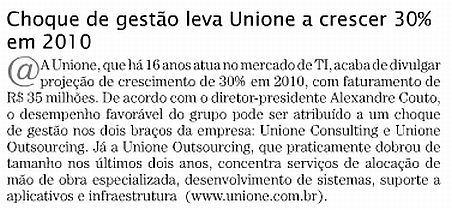 Clipping JORNAL EMPRESAS & NEGÓCIOS (IMPRESSO E DIGITAL) - Choque de gestão faz Unione crescer 30% em 2010 15/09/2010