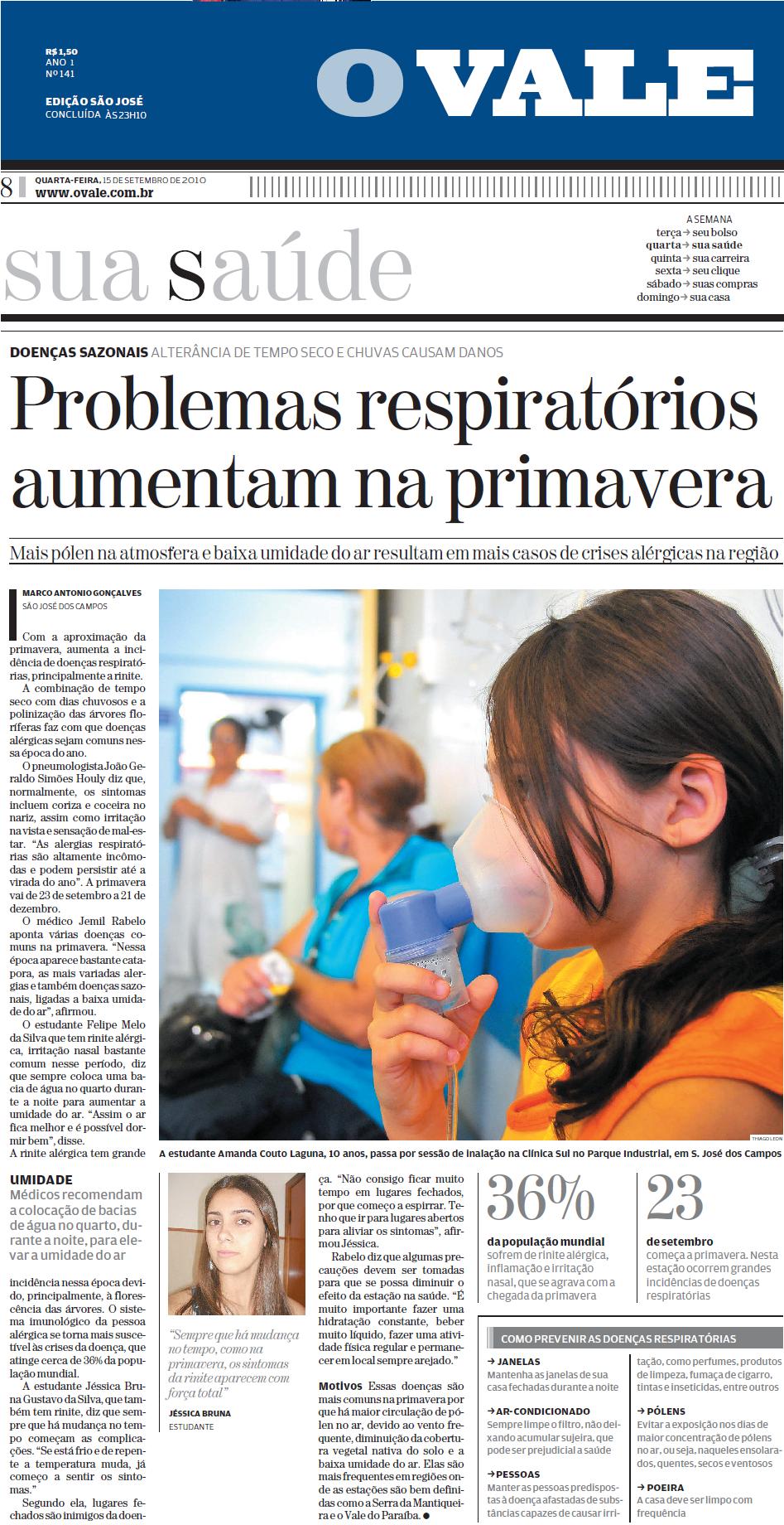 Clipping JORNAL O VALE (VALE PARAIBANO/SP) - Problemas respiratórios aumentam na primavera 16/09/2010