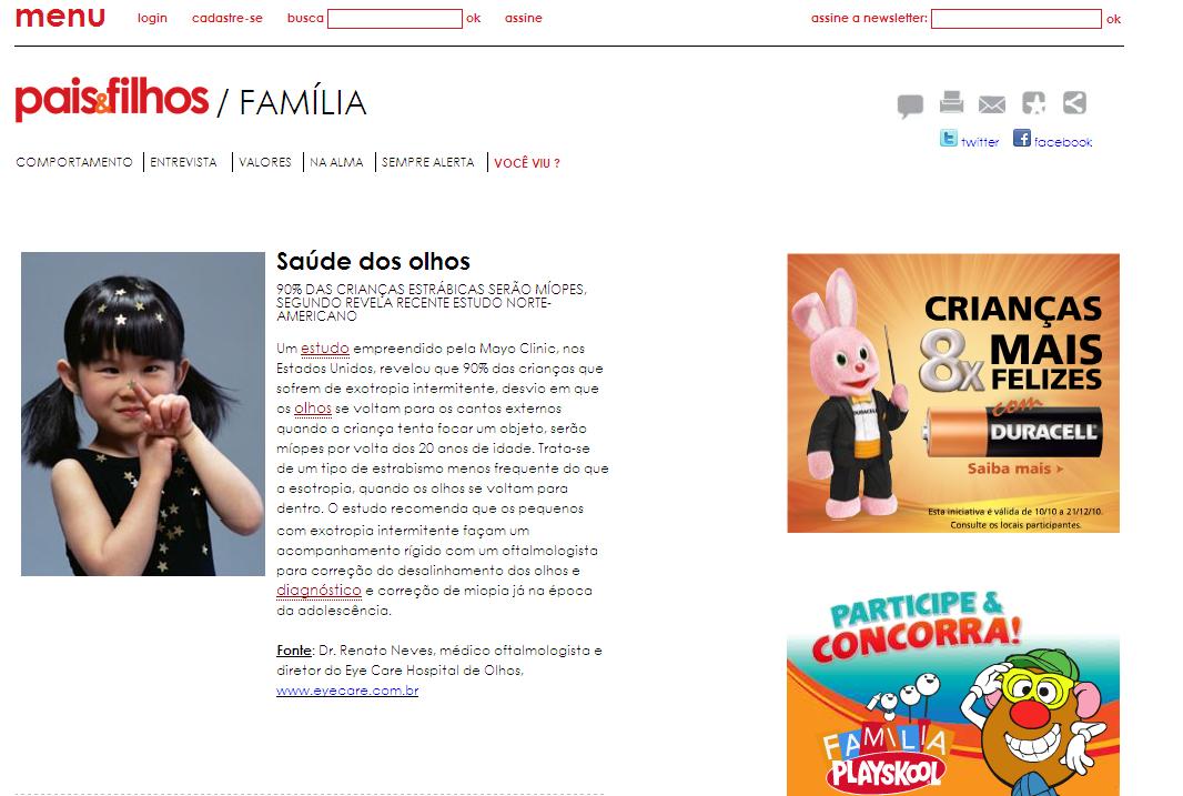 Clipping REVISTA PAIS & FILHOS (ONLINE) - 90% das crianças estrábicas serão míopes, segundo revela estudo norte-americano 08/11/2010