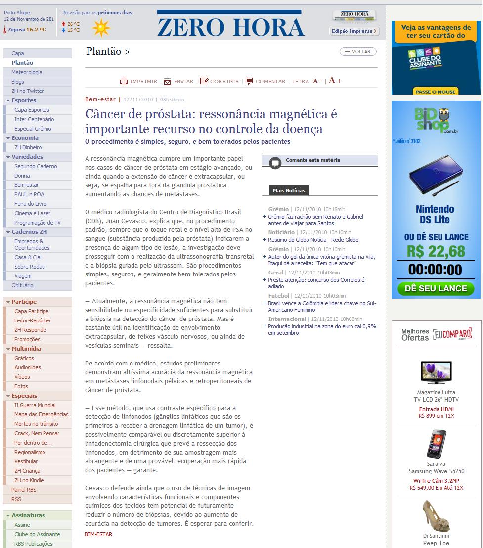 Clipping JORNAL ZERO HORA (ONLINE/RS) - Câncer de próstata: ressonância magnética é importante recurso no controle da doença 12/11/2010