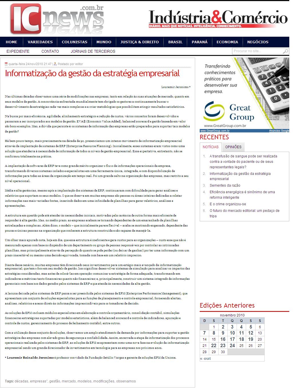 Clipping JORNAL INDÚSTRIA & COMÉRCIO (ONLINE/PR) - Informatização da gestão da estratégia empresarial 25/11/2010