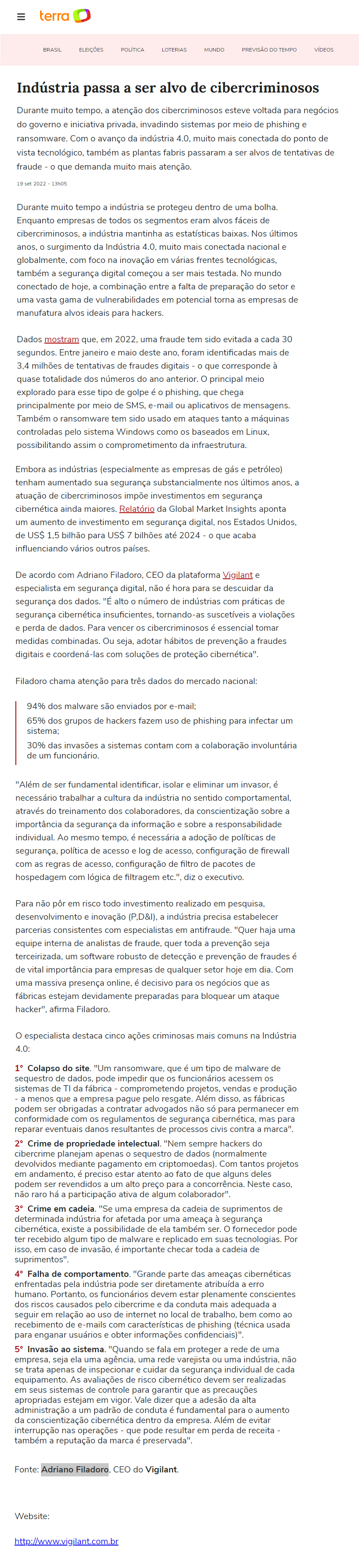 PORTAL TERRA - Indústria passa a ser alvo de cibercriminosos