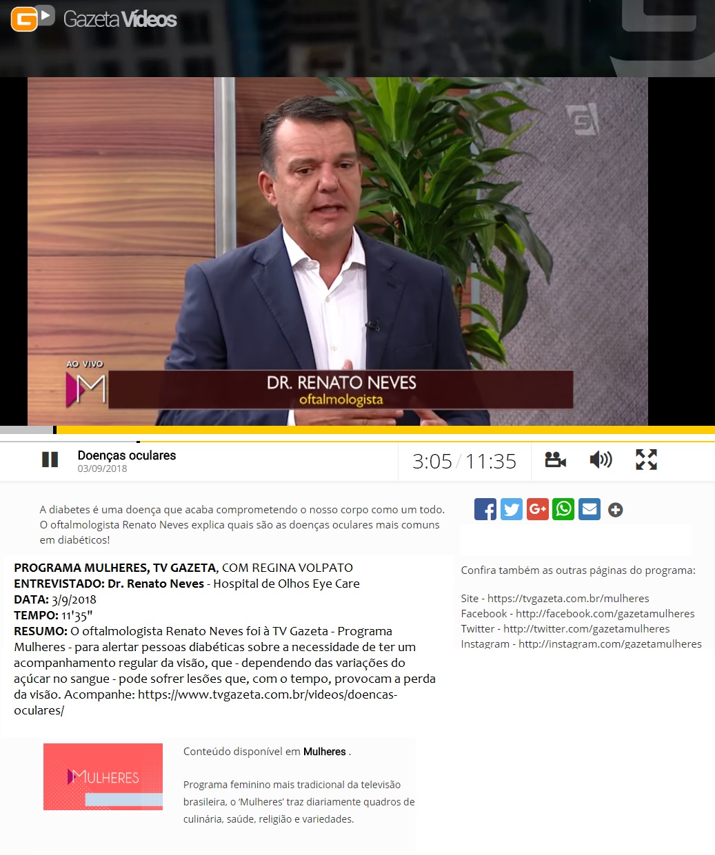 Clipping PROGRAMA MULHERES (TV GAZETA) - Dr. Renato Neves fala sobre Retinopatia Diabética 04/09/2018