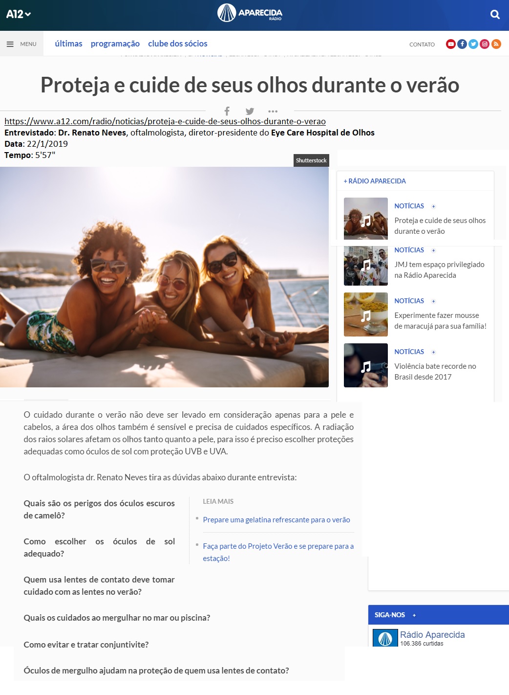 Clipping RÁDIO APARECIDA - Médico alerta sobre óculos de baixa qualidade vendidos na praia 22/01/2019